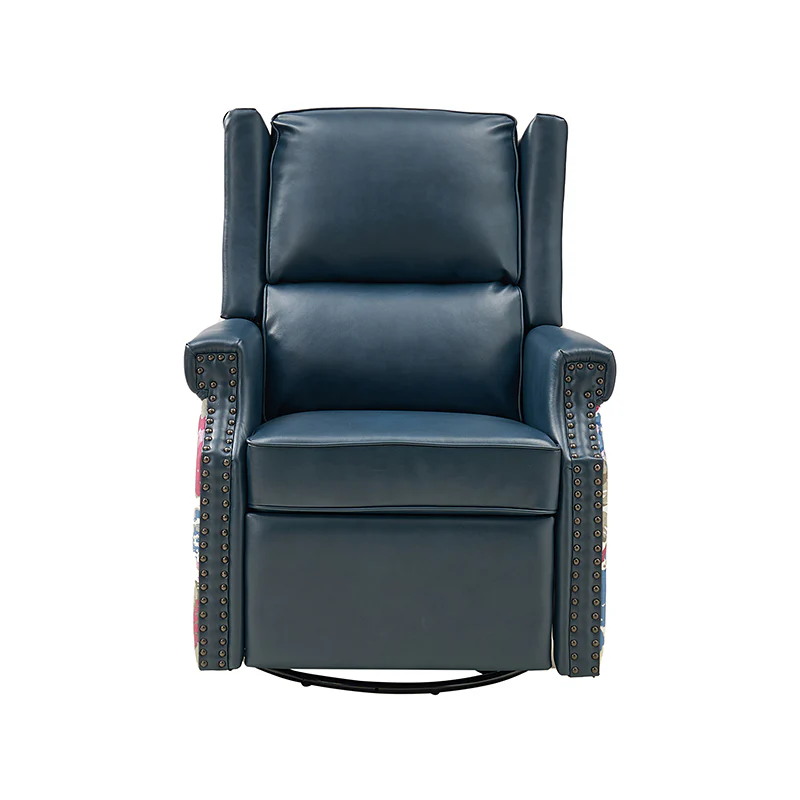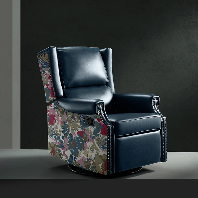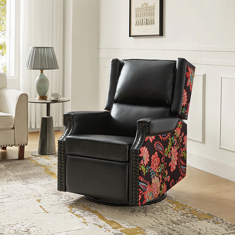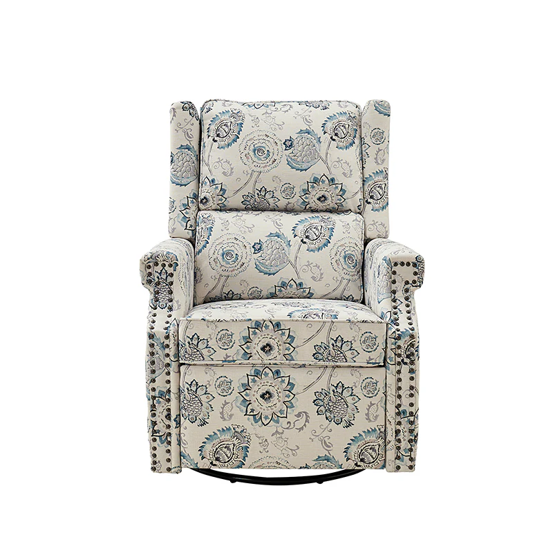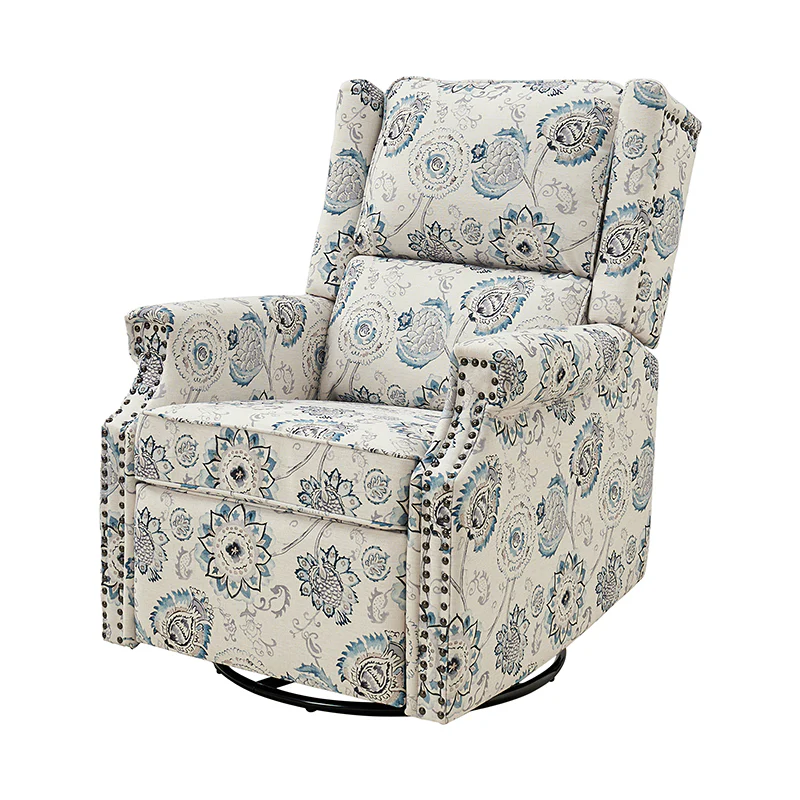 This upholstered swivel rocking recliner boasts a charming floral patterned design, adding a touch of elegance to any room. Its swivel and rocking function make it a versatile choice, providing both rocking and rotational movements, complemented by the reclining option for relaxation. Crafted with high-density foam seat and back cushions, this recliner ensures a comfortable seating experience. The traditional style recliner is accentuated by unique features such as a wingback design, shaped track arms, and exquisite nailhead trims. Crafted with a durable structure made of sturdy wood and metal, this recliner ensures longevity and stability. Elevate your home decor with this seamlessly functional recliner, where classic design meets modern convenience.