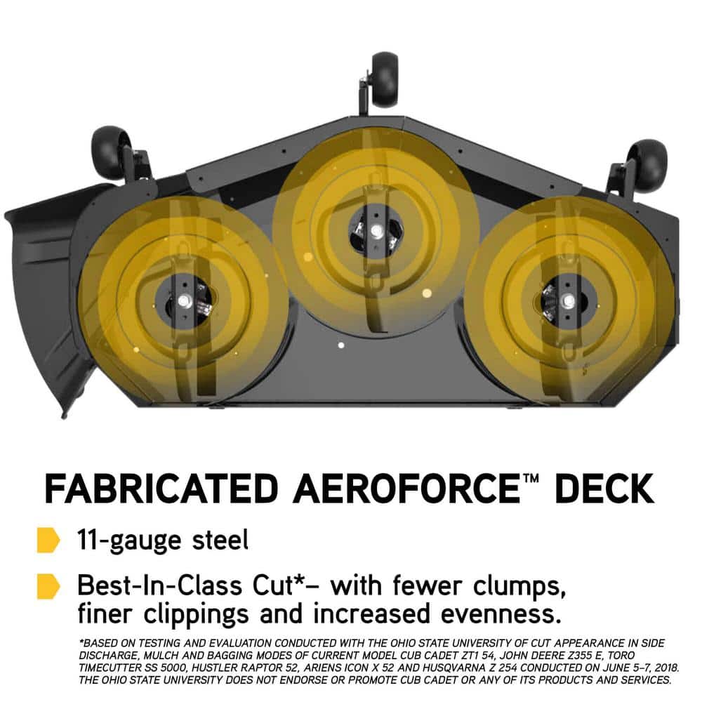 60 in. AeroForce fabricated deck with heavy-duty reinforced leading edges and cutting system that delivers a signature cut with fewer clumps and stragglers, finer clippings and increased evenness