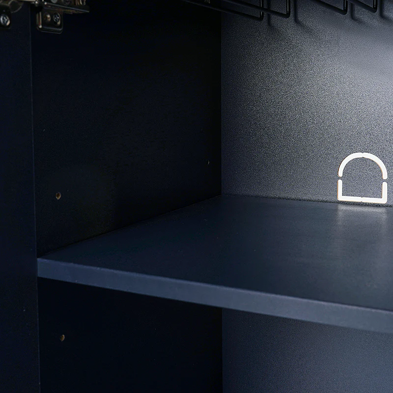Presenting a sleek and contemporary sideboard featuring a linear groove design on the doors, seamlessly blending into modern decor. Equipped with two discreet drawers, perfect for storing essentials out of sight, and a dedicated wine glass rack for organizing stemware. The three adjustable shelves provide versatile storage options, catering to your organizational needs. A multimedia hole ensures easy cable management, maintaining a clutter-free aesthetic. The sideboard is adorned with stylish iron handles for a chic finish, complemented by sturdy metal legs that enhance its overall durability. Fine-tune the sideboard's position with adjustable feet, ensuring a fit for your living or dining area. Elevate your space with this versatile sideboard, combining form and function effortlessly.