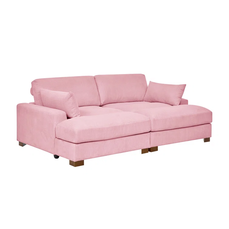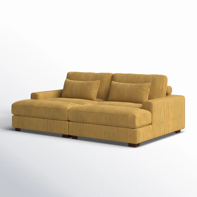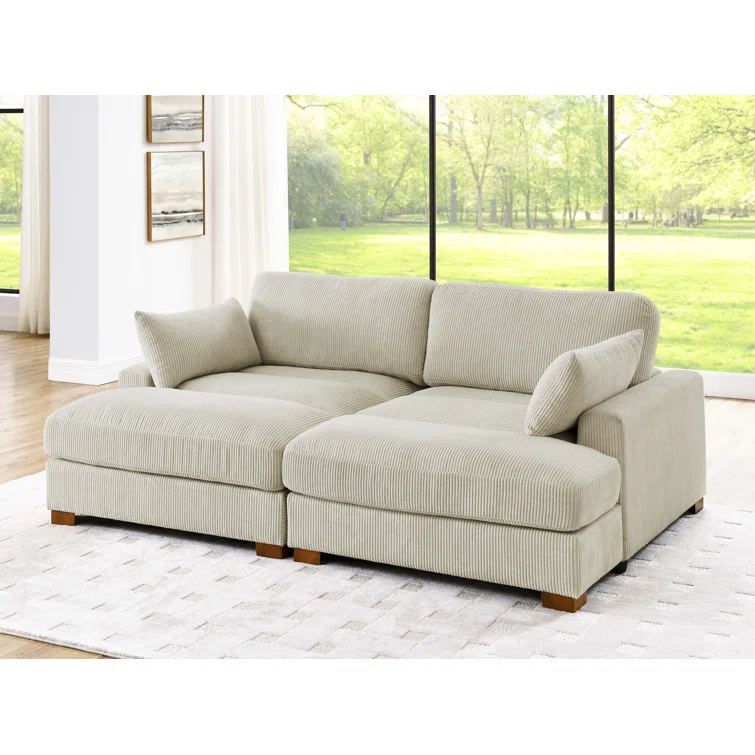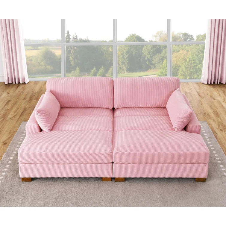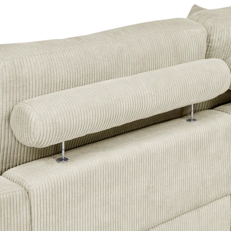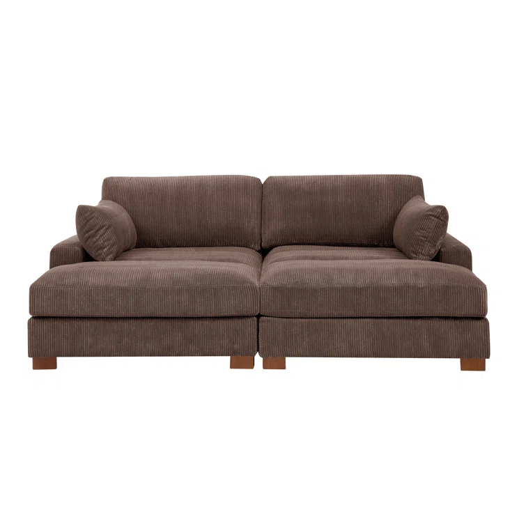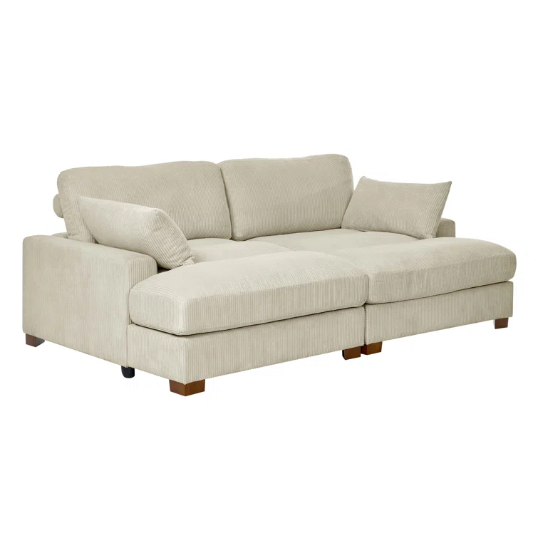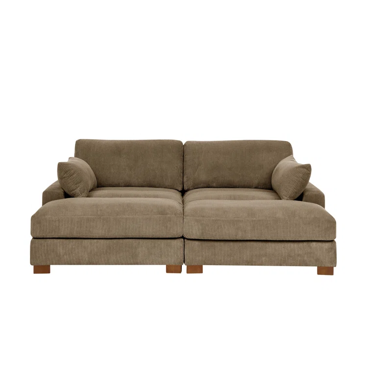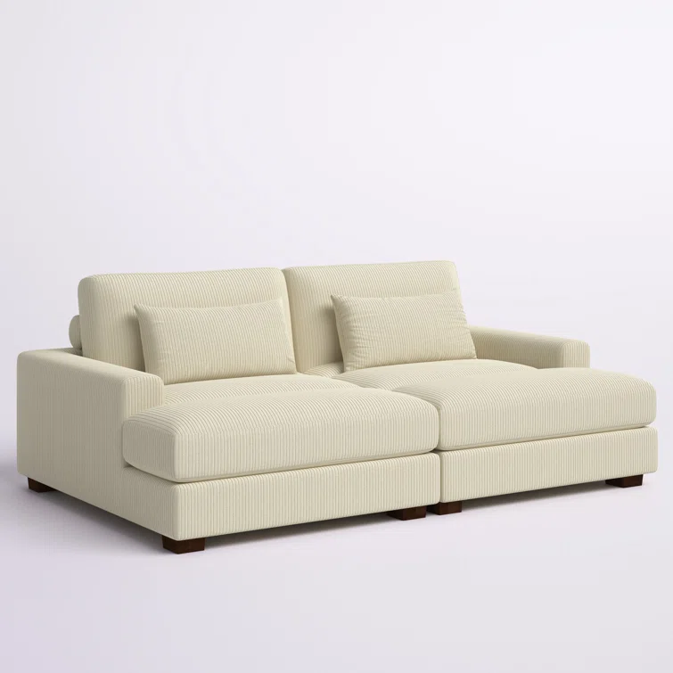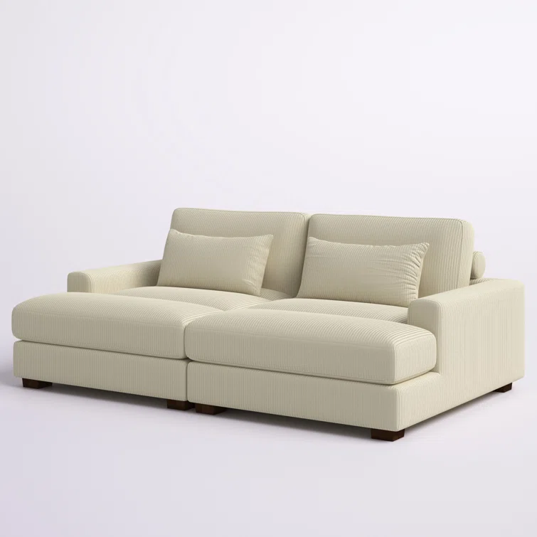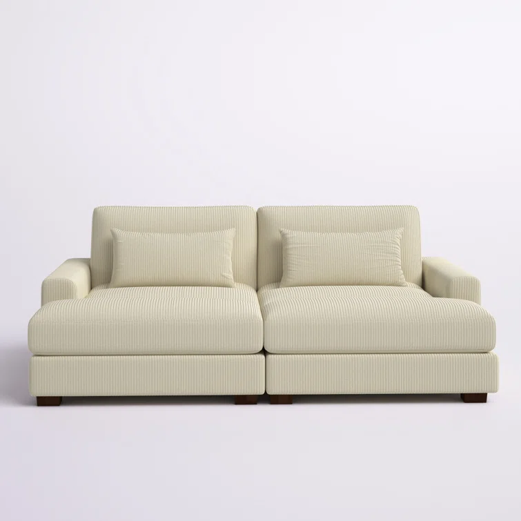 This convertible sofa brings spare sleeping space and glam style to your living room. Designed to seat two as a couch, it converts into a twin-sized bed that's just right for overnight guests. It's crafted with an engineered wood frame, and it sits on solid wood block feet with a brown finish. This sofa is wrapped in corduroy upholstery in a neutral hue, and its cushions are filled with foam and supported by coil springs to help prevent sagging over time. This sleeper sofa features square arms, a cushion back, and includes two toss pillows for an instantly curated look.