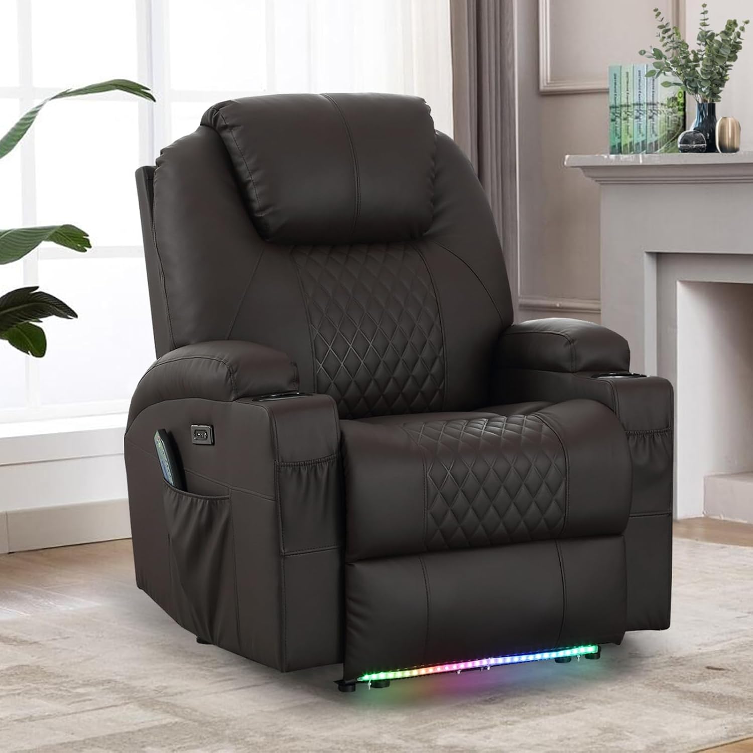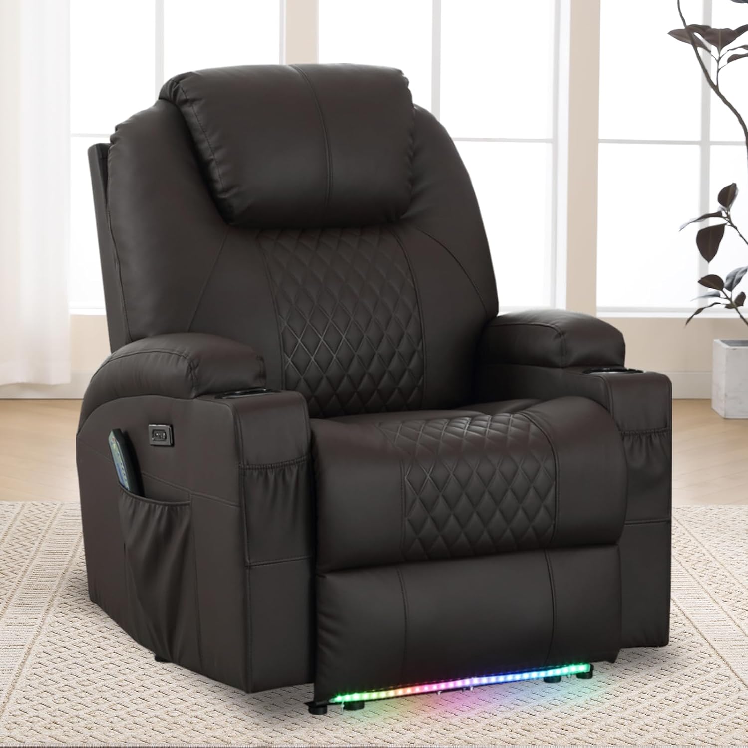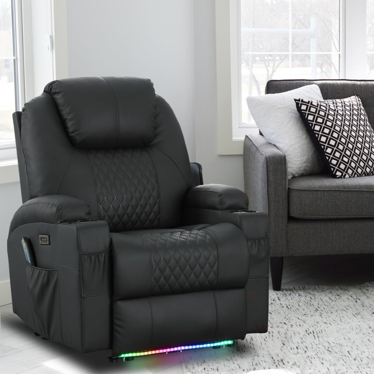- MOVIE THEATER CHAIRS: Elevate your living room into a captivating home theater experience. Our chairs feature LED lights that create a mesmerizing ambiance, bringing the immersive feeling of a movie theater right into your home. The base light bar confirm easy seat location in the dark. Whether you're gaming in your video game room or relaxing in your bedroom, this multifunctional recliner provides comfort, style, and versatility. Great for RV replacement furniture as well