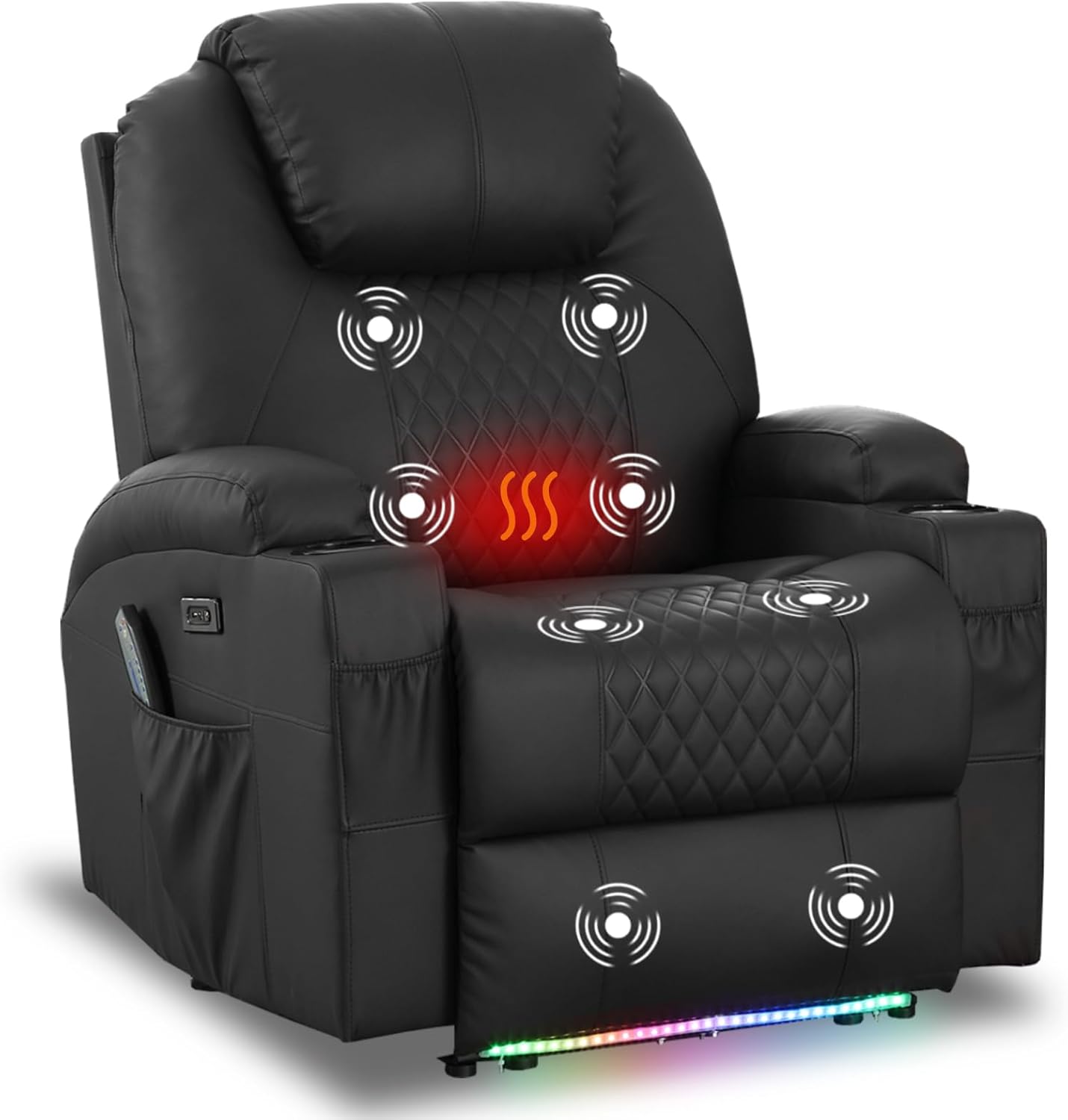 - VIBRATION MASSAGE RECLINER with HEAT: Equipped with 8-point vibration massage, 5 massage modes, 2 intensity levels, and 3-time modes, this chair provides a customizable massage experience that targets your back, thighs, waist, and legs. The soothing lumbar heating function alleviates discomfort, stress, and fatigue, offering a full-body relaxation experience. the extra wide recliner ergonomic design, this recliner confirm maximum coziness and convenience.Requires just 7" of clearance for our wall hugger recliners