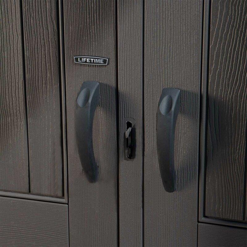 Description This compact shed is ideal for a driveway or carport where there is limited space. Keep tools and automotive supplies handy, safe, and secure in this highly durable, low maintenance Lifetime shed. Constructed from UV-protected, high-density, double-walled polyethylene plastic with steel reinforcements. Won't rust or dent like metal sheds. Won't fade, crack, or splinter like wooden sheds. This shed comes to a full-length skylight that provides natural interior lighting. The steeply pitched roof allows for quick drainage of rain and snow, and the shorter roof span allows a greater snow load capacity than our larger sheds. Double-wide doors allow for easy access. Keep your tools and automotive supplies organized and located right where you need them in the driveway