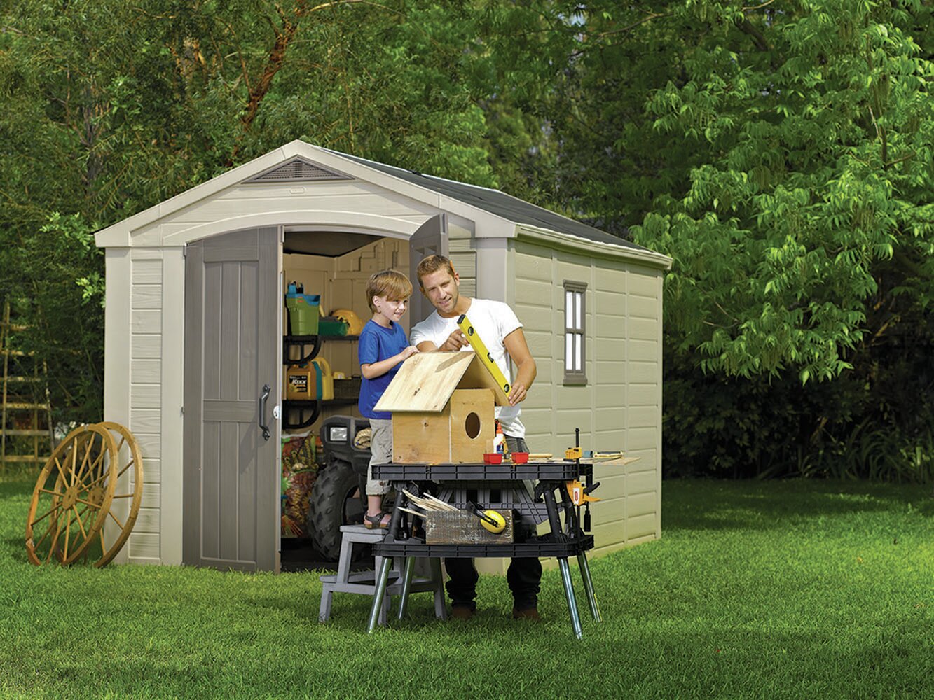 Is your garage cluttered with garden tools, step ladders, or lawn furniture. Do you need some extra room to store your push lawn mower. Get organized with the Keter Factor 8x11 resin shed. This shed provides the extra space you require at a price you can afford. The Factor 8x11 shed is easy to assemble and lasts far longer than wooden sheds because it won't rot, crack, or warp under the elements. With a Keter shed, you never have to worry about termites or other pests and the Factor shed is virtually maintenance free. To clean an outdoor Keter storage shed, simply wipe it down with a damp cloth several times or lightly hose off the exterior. There's no need for expensive chemical cleaners. You can use the shed 8x6 shed to store your rakes, shovels and other tools. The large double door opening makes storing your riding lawn mower.an easy task and leaves plenty of room for your other things. With a fixed window, skylight and extended roof line, the shed won't feel claustrophobic or dark and the air vents near the roof ensure that gasoline and other chemical fumes won't build up over time.
