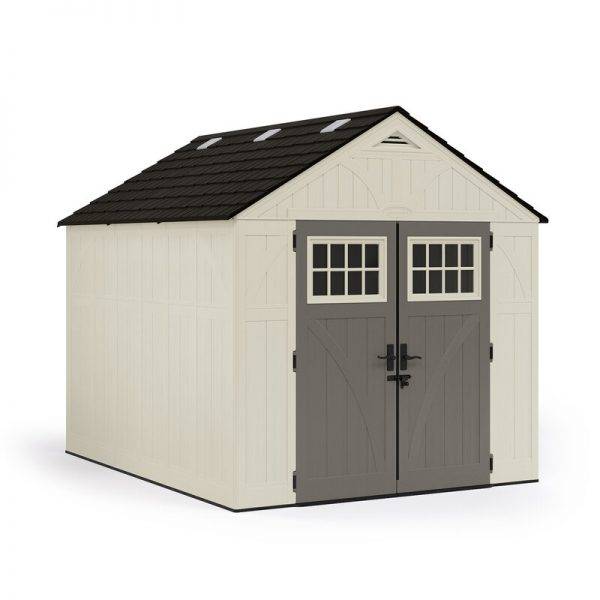 This shed makes essential organization simple. It features a reinforced floor to support tractors and other large items, and can easily house all your tools, outdoor supplies, and more. The multi-wall resin exterior is built for superior durability. Additional features include six skylights to bring in natural light, two corner shelves that can be used in eight different locations, and metal, lockable handles to keep your valuables safe and secure.