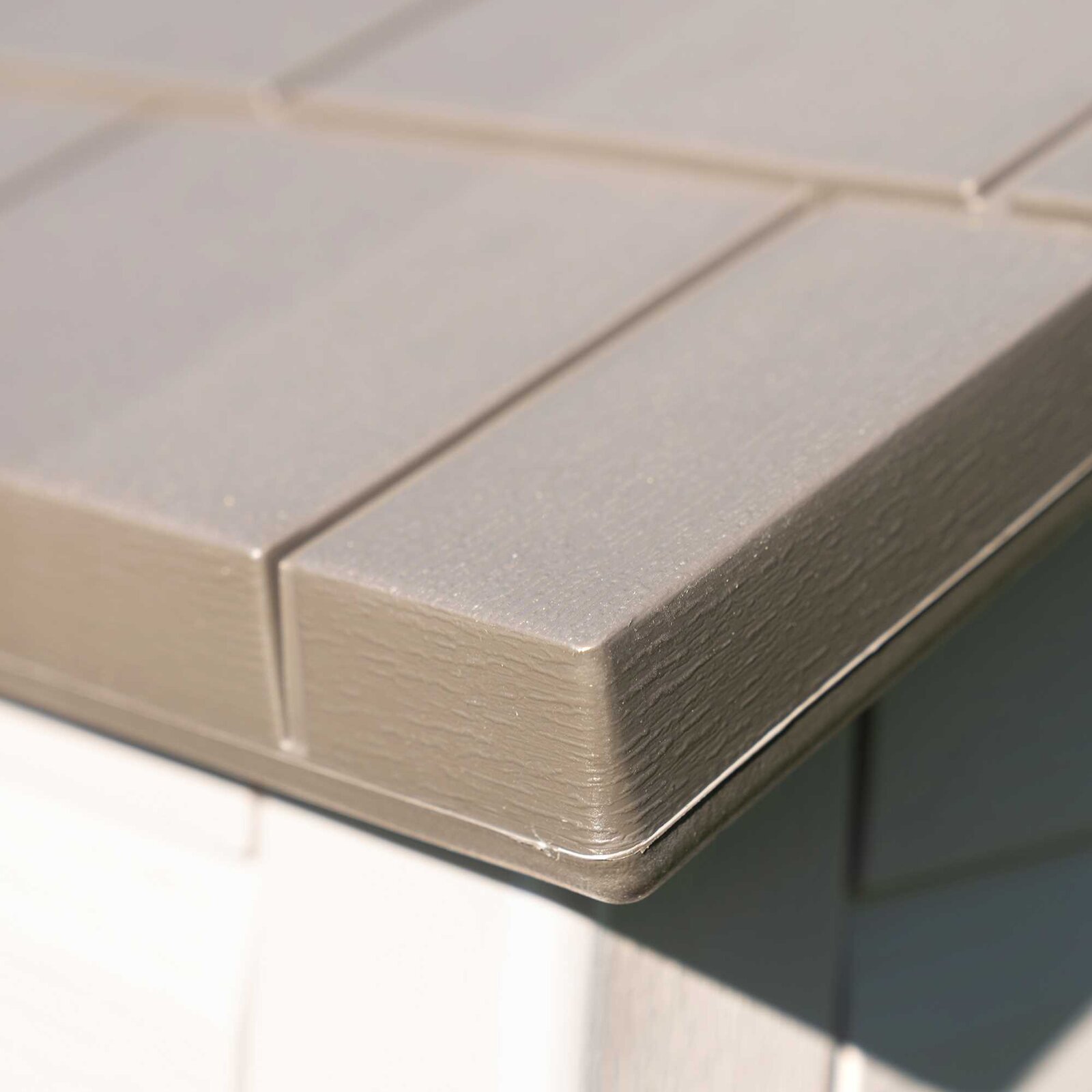 This Side 10 ft. W x 8 ft. D Steel-Reinforced Polyethylene Storage Shed will provide the perfect storage space for all your tools. It is the perfect addition to your outdoor space and it will keep your tools well-organized. It is constructed from steel and double-wall Steel-Reinforced Polyethylene that offers years of reliable use. The gable roof lends a traditional style to the garden shed. The desert tan and dark brown finish of the tool shed brings a classic look to it and it also enhances its overall appearance. It includes four small skylights, two large skylights, and two corner shelves. The screened vents will provide airflow and keep the shed pest free. Its rear window can be kept open for extra ventilation. The two shatterproof poly-carbonate sides will allow light and air to come in the shed and maintain a fresh ambiance. The high-density and slip-resistant plastic floor will provide excellent stability and your tools will be easier to access.