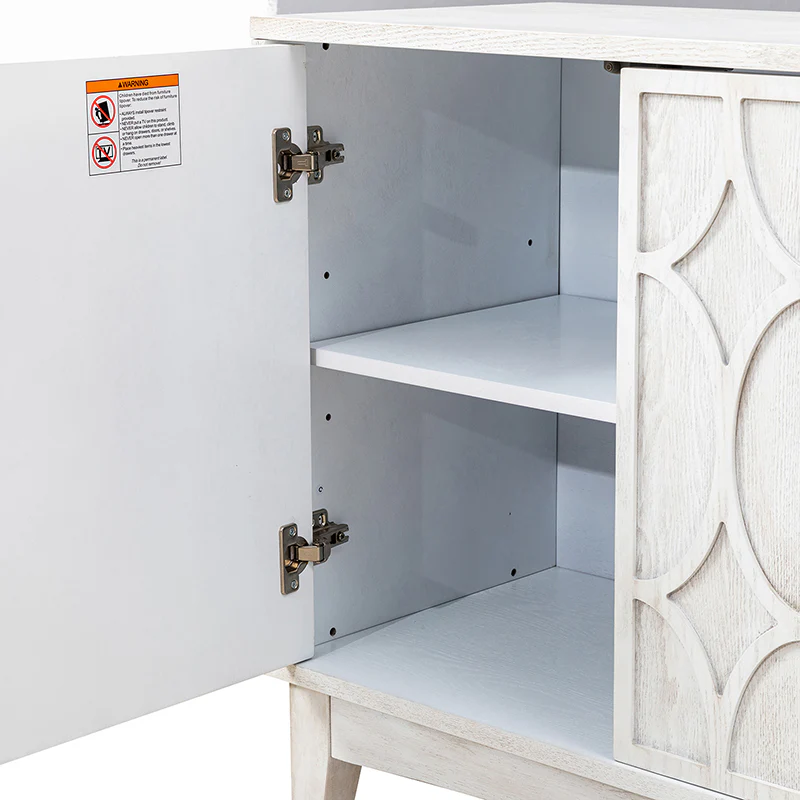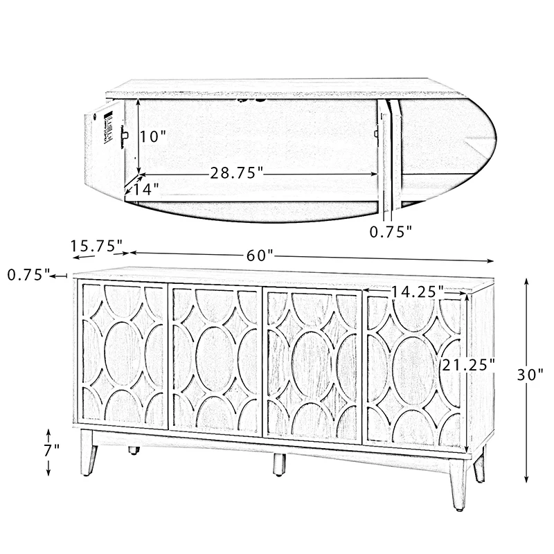 This versatile sideboard showcases geometric design doors and chic mullion prints for a glam Art Deco design in your dining room or living room. This modern sideboard has four doors that open up to reveal adjustable shelf space for dishes, glasses, and books. It also has a 60" wide surface, making it ideal for placing down essential bar items and a vase of fresh flowers. It features finger-groove door pulls lend, so you can easily press and open the cabinet door. The ample storage space and freestanding design are perfect for your dining room, living room, entryway, or any contemporary living space. Use this sideboard to get rid of the mess in your room.