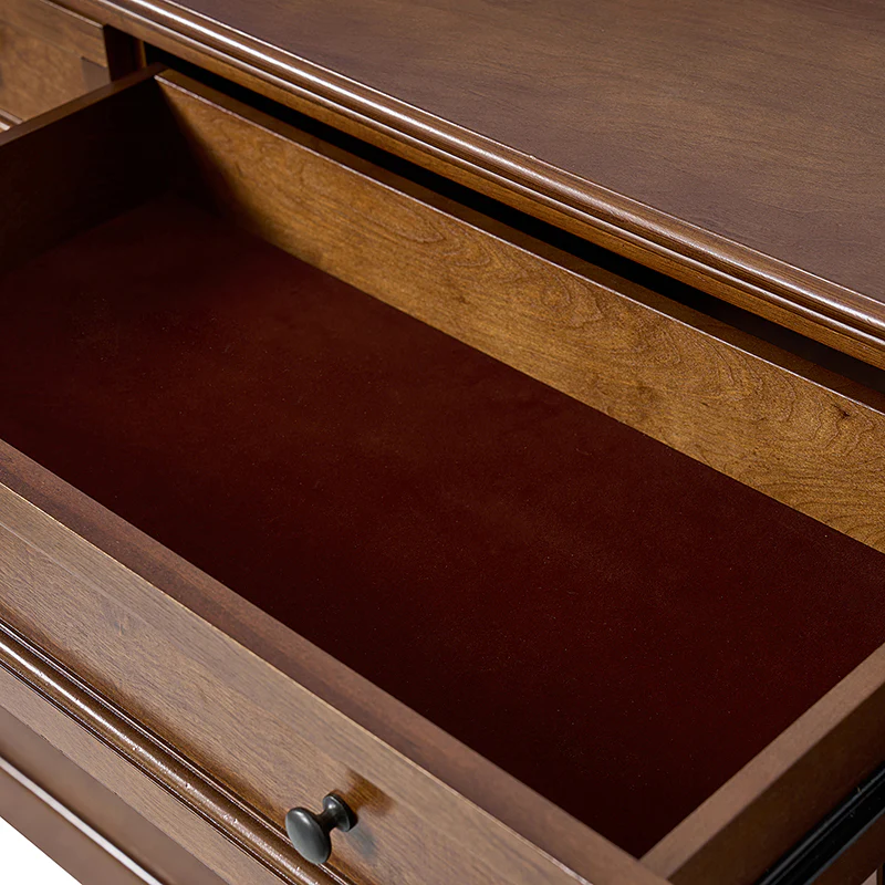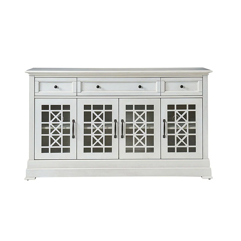 This elegant sideboard is a versatile addition to any dining or living space, designed with both form and function in mind. It features three drawers, with a felt-lined bottom drawer in the center, ensuring daily items are protected from scratches, making it an ideal storage solution for your tableware. The cable management system discreetly organizes wires, maintaining a clutter-free space. Its versatility shines through with an adjustable shelf, catering to varying storage needs. The sideboard's glass fronts are adorned with a chic crisscross pattern, adding a touch of sophistication while showcasing your cherished items. Plus, it rests on adjustable feet, providing stability on different surfaces, making it a practical and stylish choice for your home.
