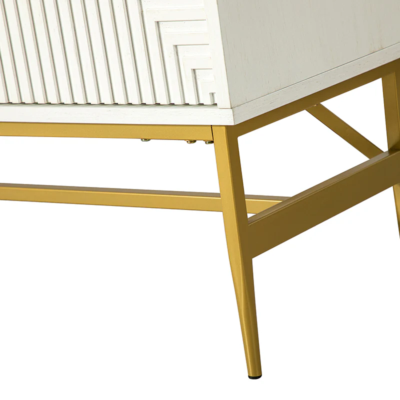Update your dining area with this contemporary sideboard for elegant entertaining. Standing on a sleek rectangular silhouette in sturdy wood and slim iron legs, it has mid-century modern appeal. ?Featuring a geometric and channeled texture on its doors and the sideboard's geometric patterned facade gives it texture and subtle depth. Open the four doors to reveal two shelves with plenty of space for everything from tablecloths to cutlery. Display as a decoration on top or use as a coffee and dessert station when entertaining a crowd. We love the finished back of this modern piece, which offers a variety of options for multiple placements in the room.