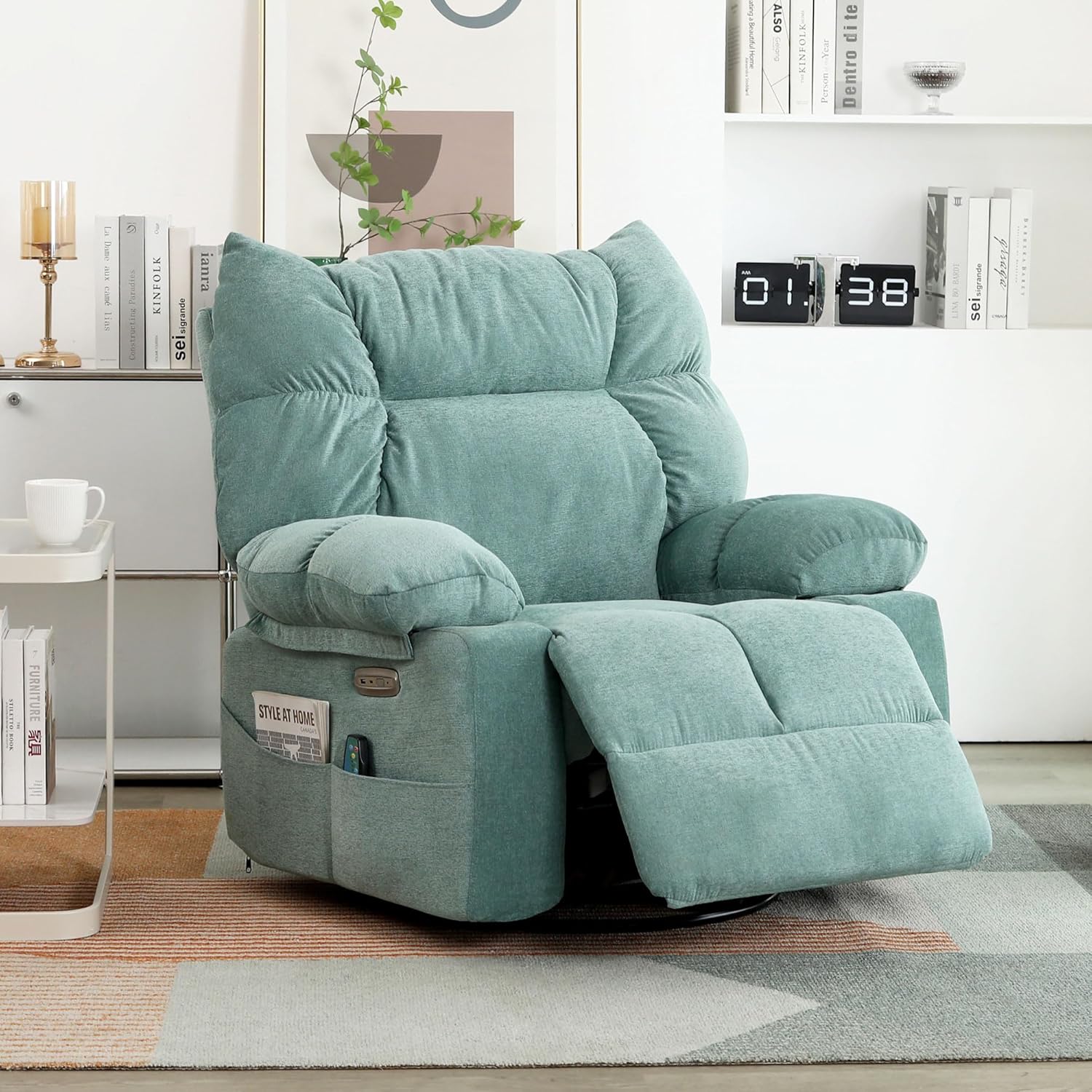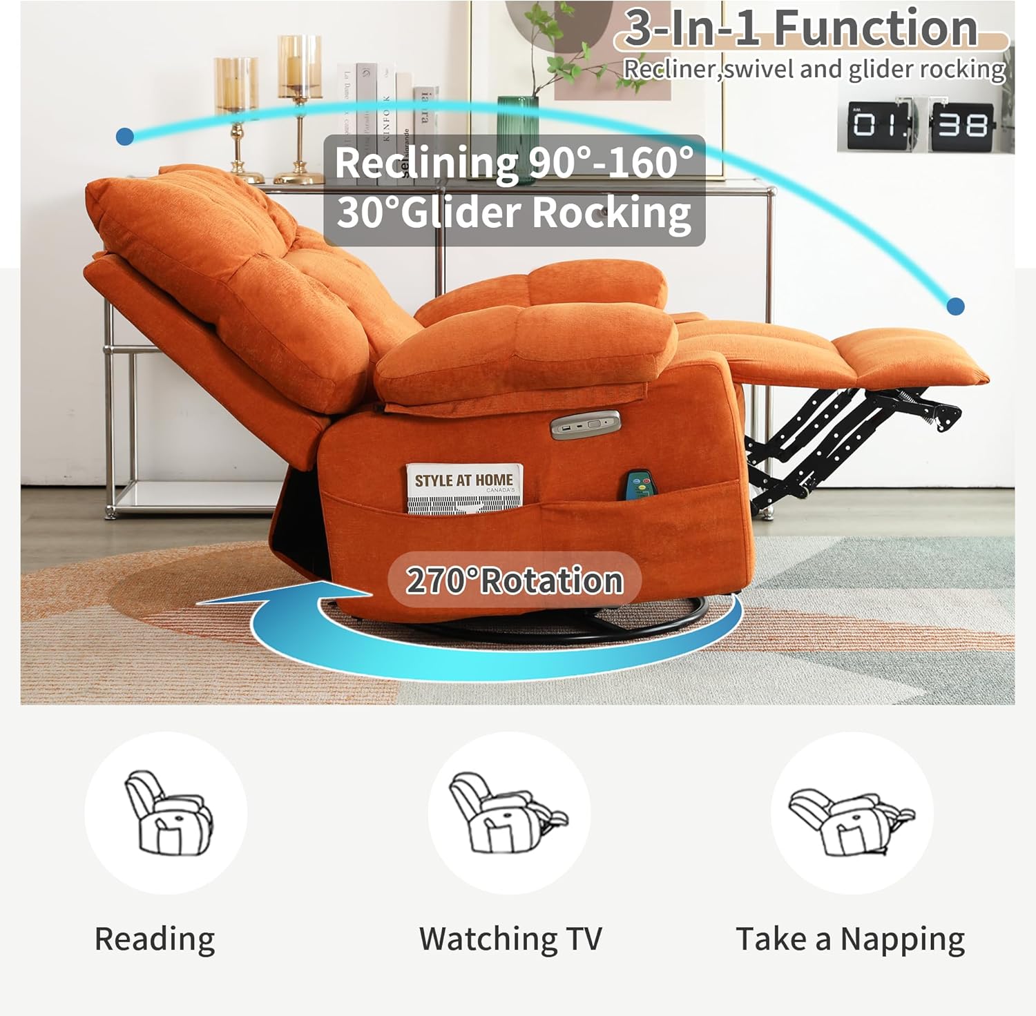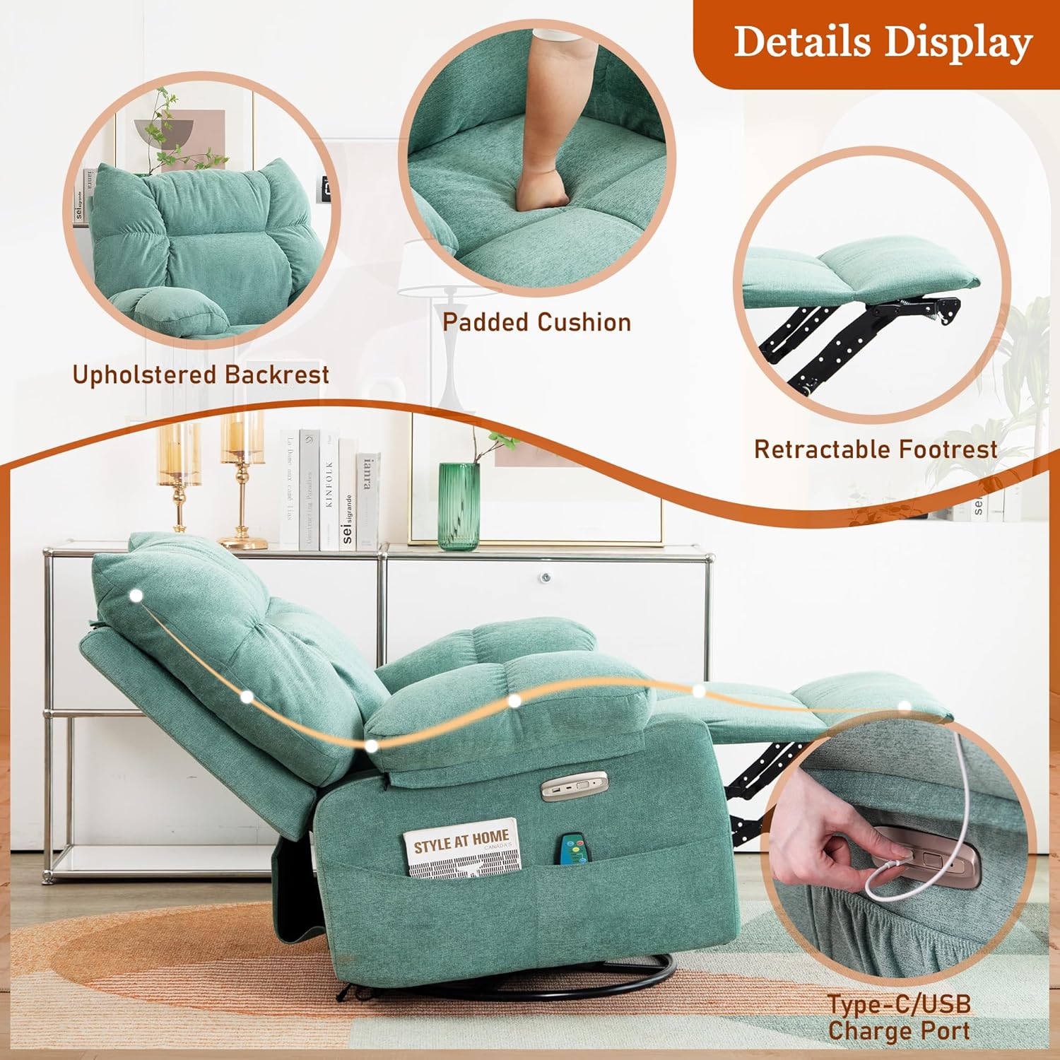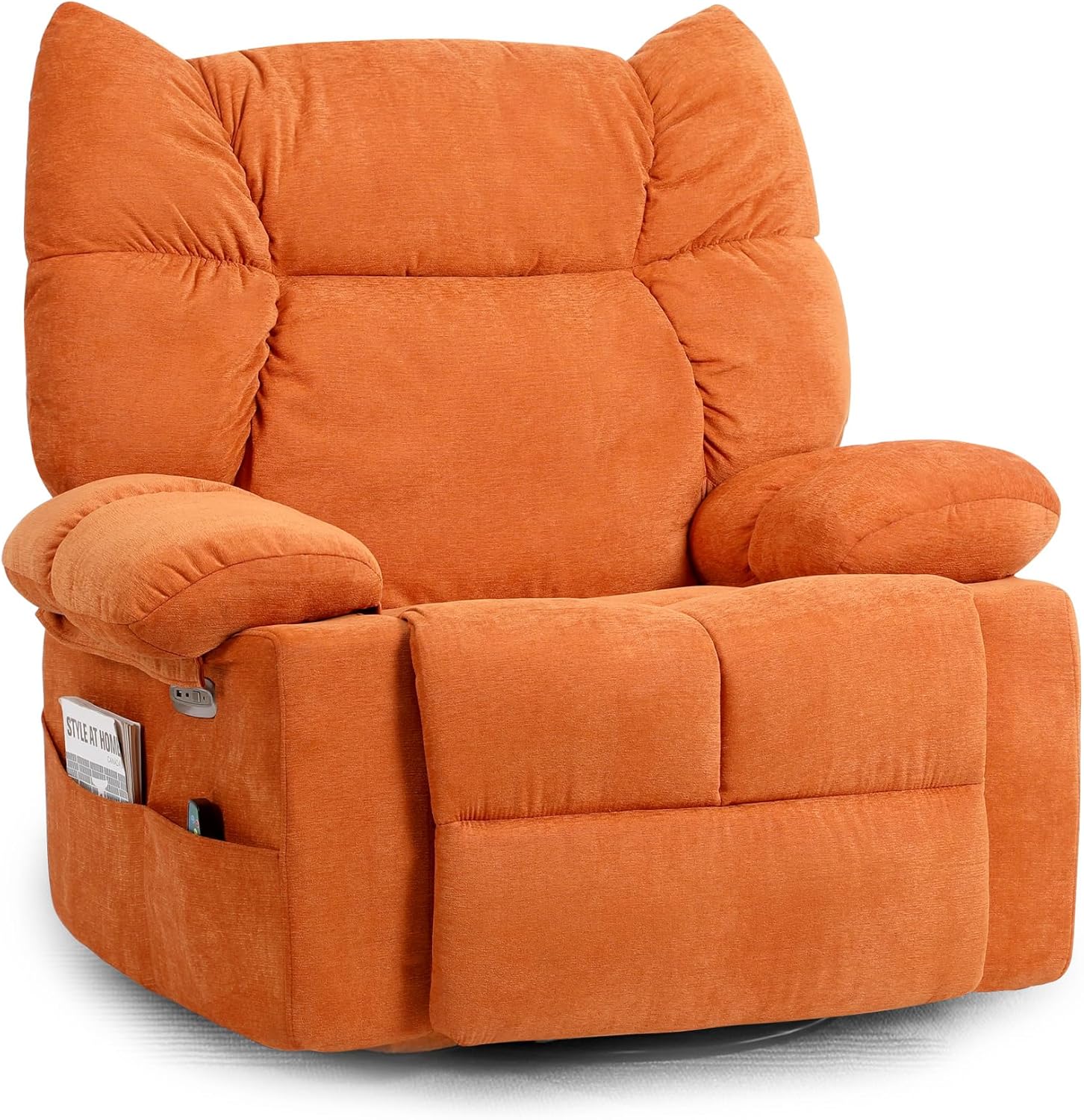 - 【USB & USB-C Ports】 DYHOME swivel rocking recliner chairs for adults are conveniently set up with USB and USB-C ports, allowing you to keep your devices charged while enjoying your leisure time. Meanwhile the large side pocket design is convenient for you to store magazines, remotes or other essentials.