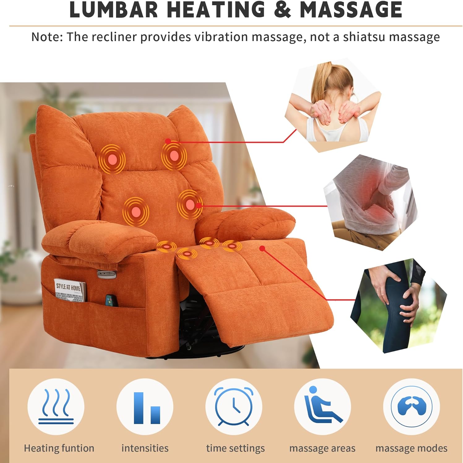 - 【Massage & Heated Function】This swivel recliner chair is specially designed with 8 vibrating points massage (back/waist/thighs/legs) and lumbar heating function, which is targeted at relieving pain, promoting blood circulation, and eliminating fatigue and stress. Use the remote control to select different modes and intensity, convenient and practical.