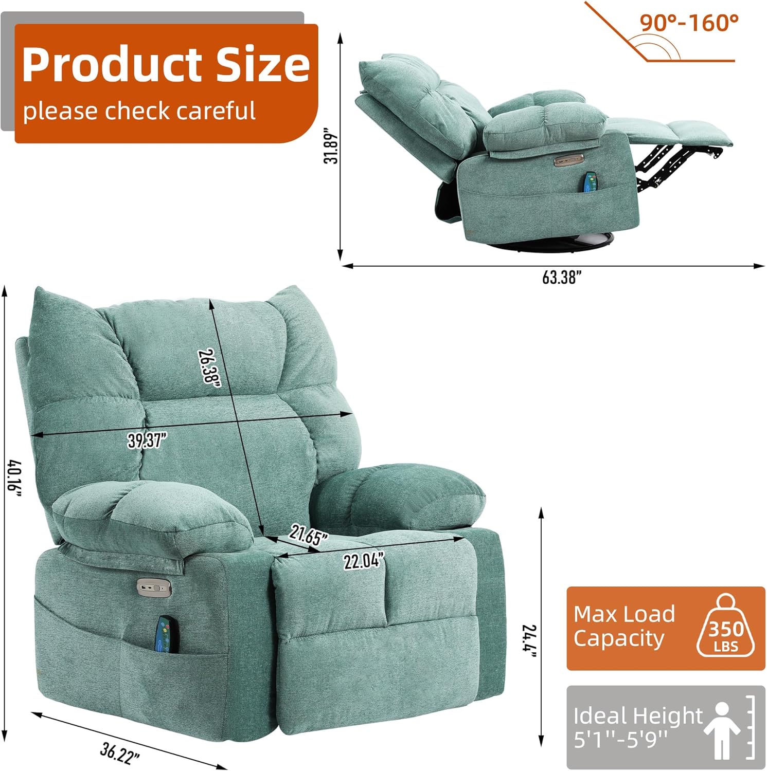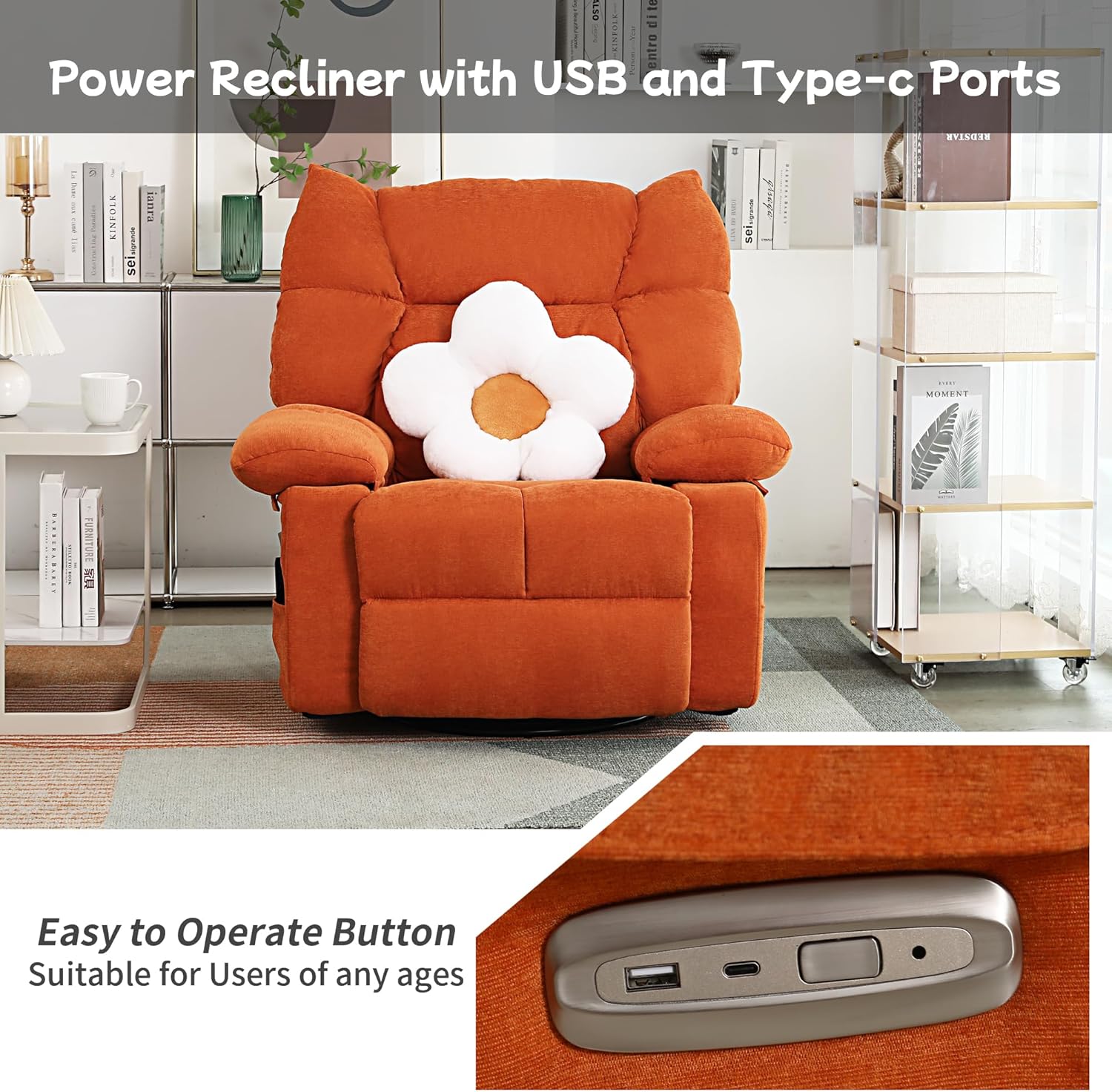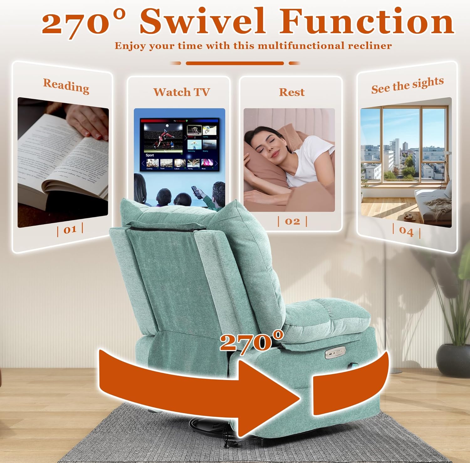 - 【Power Adjustable Recliner】Are you still bothered by the difficult to retract footrest of manual recliners? Try this upgraded power recliner chair from us! With the touch of a button, you can adjust the angle of the backrest (90°-160°) and the height of the footrest (0-90°)at will. Meanwhile, the 270° swivel and 30-degree forward/backward horizontal rocking function bring you the ultimate comfortable home theater experience.