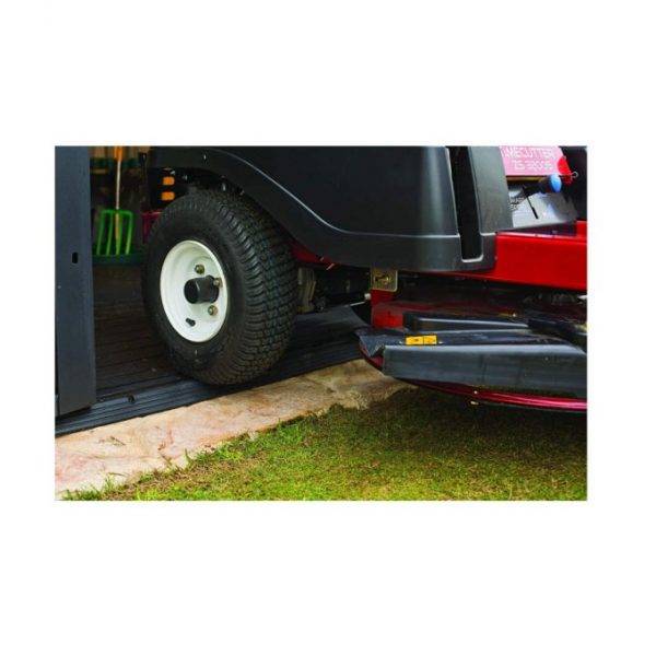 It has a heavy duty, reinforced floor to support heavy equipment such as a riding mower.