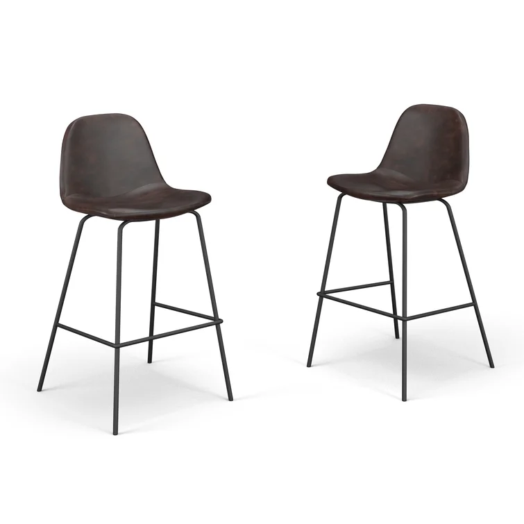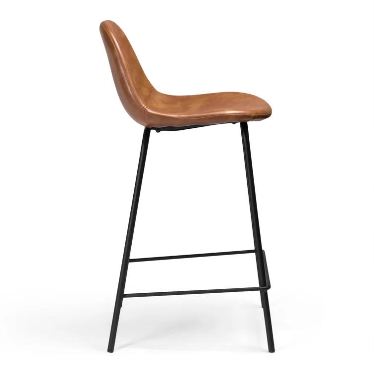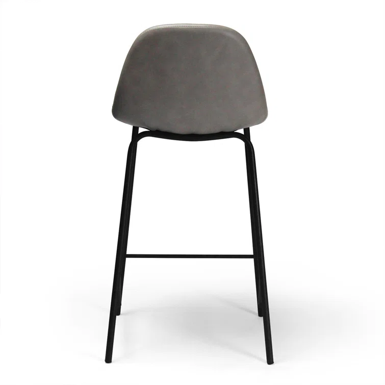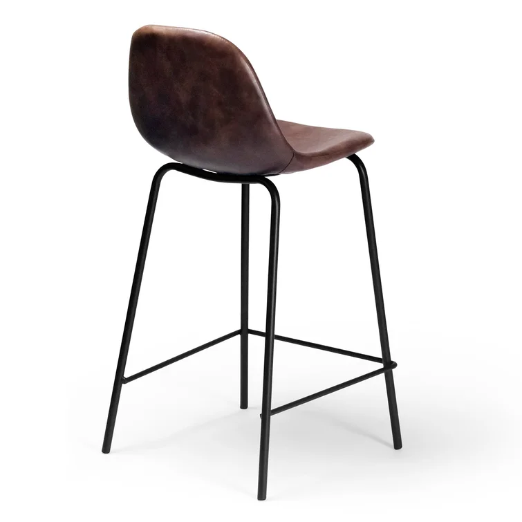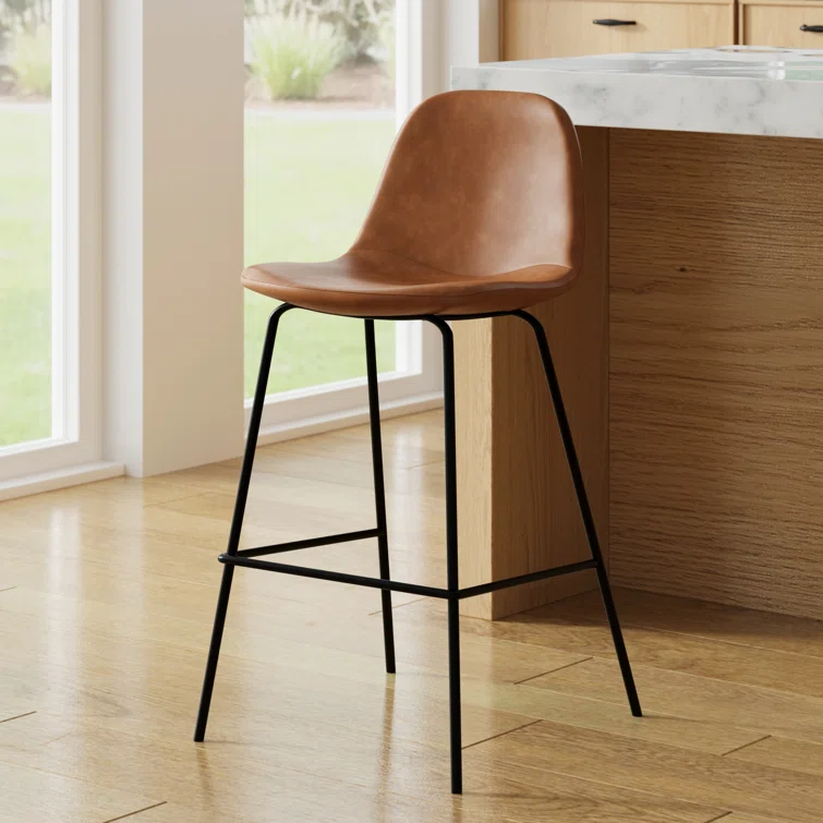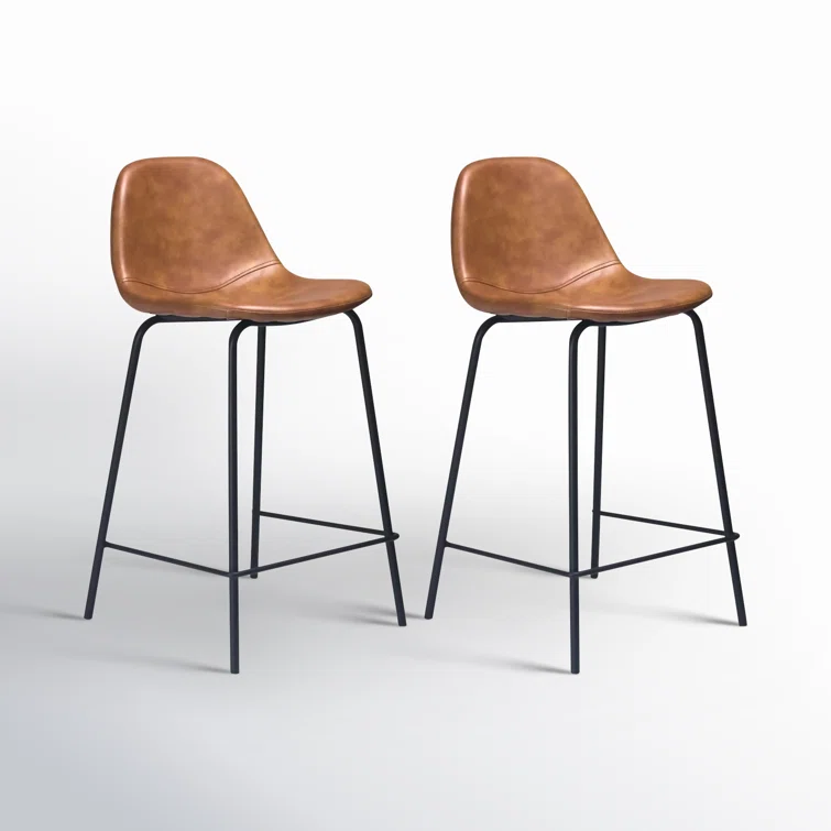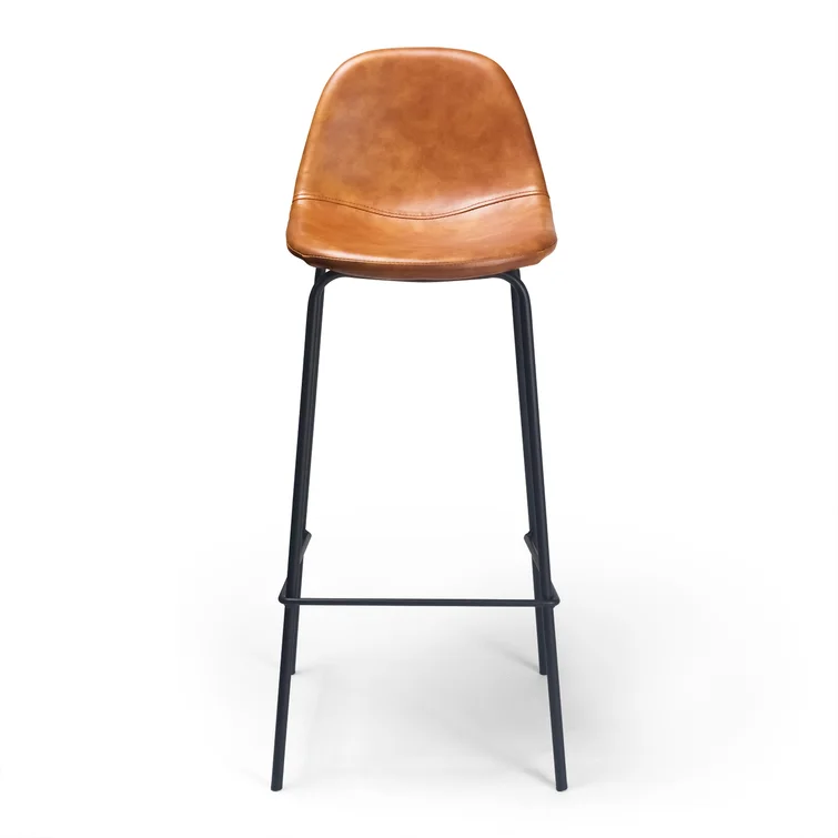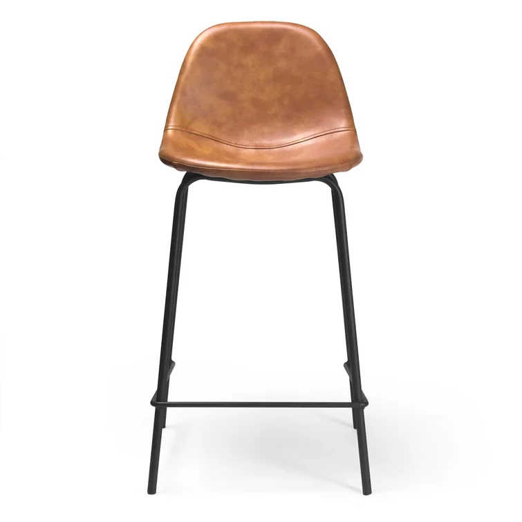 A laid-back blend of mid-century and industrial styles, this dining stool wraps an armless bucket seat in low-maintenance faux leather embellished with decorative stitching. Its open metal base features a footrest for stability and plastic glides to protect your floors. Set of two.