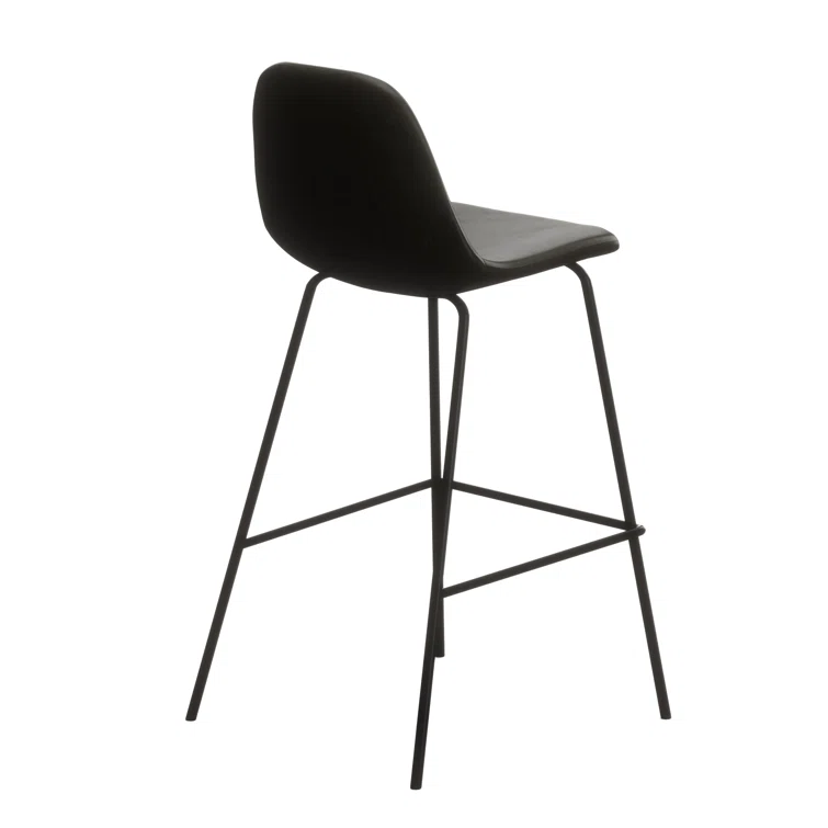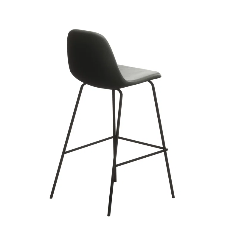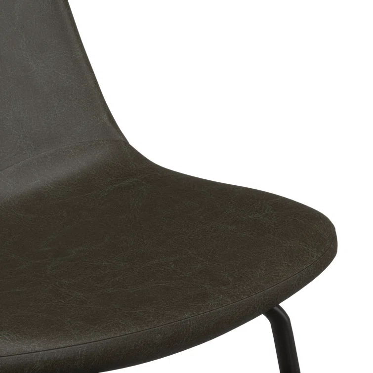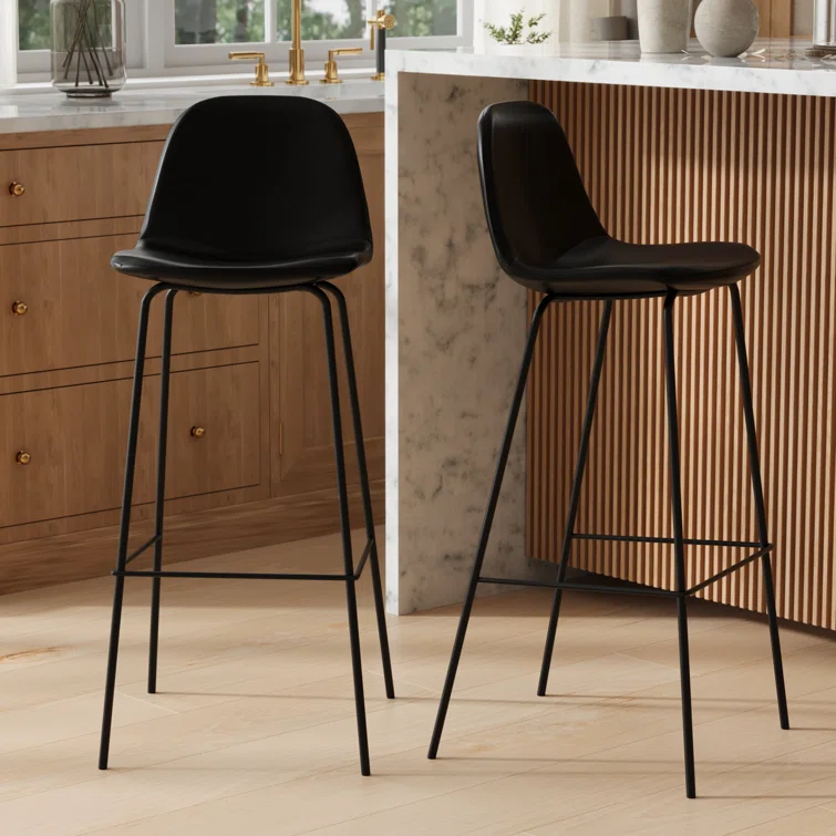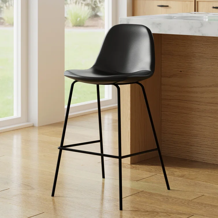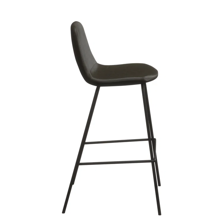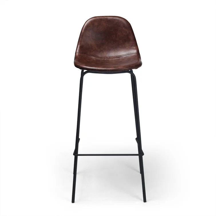A laid-back blend of mid-century and industrial styles, this dining stool wraps an armless bucket seat in low-maintenance faux leather embellished with decorative stitching. Its open metal base features a footrest for stability and plastic glides to protect your floors. Set of two.