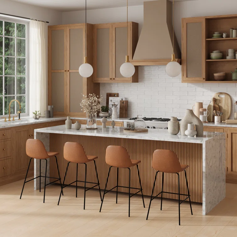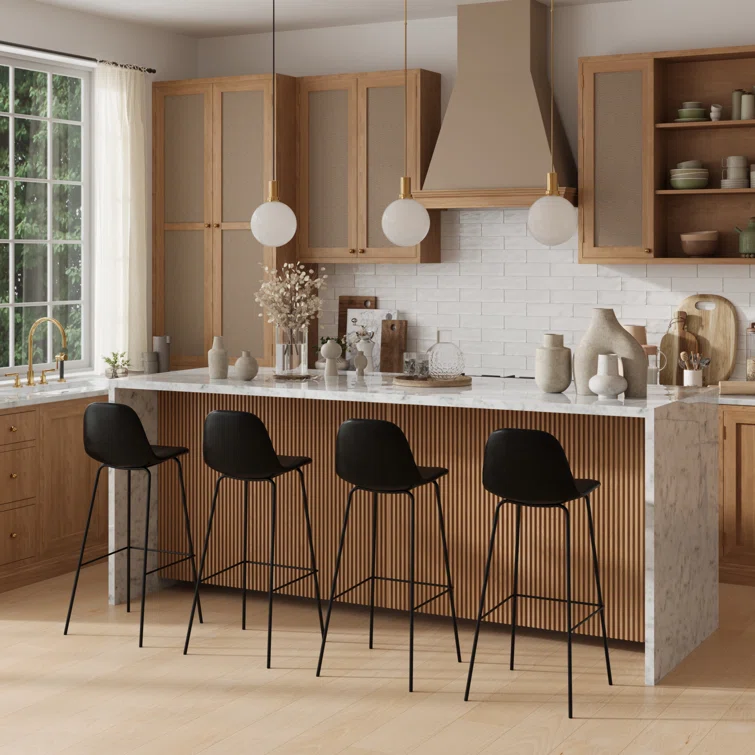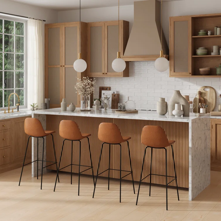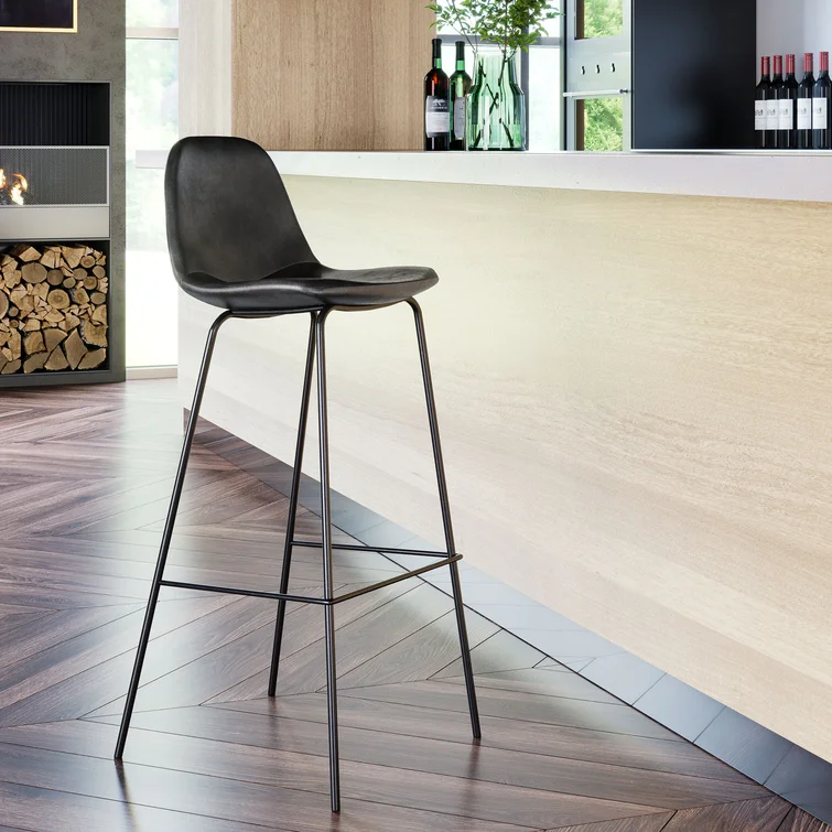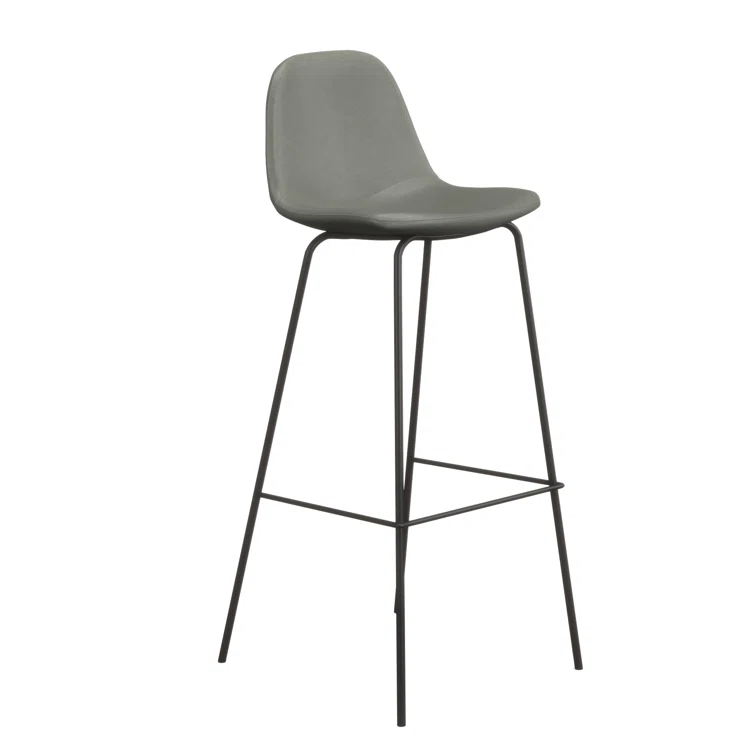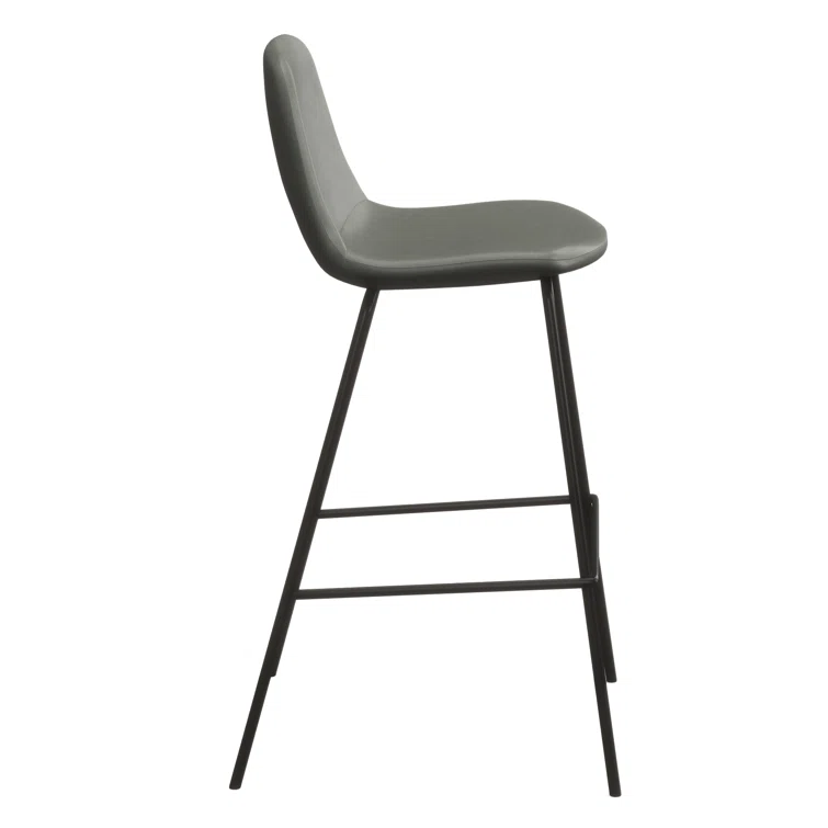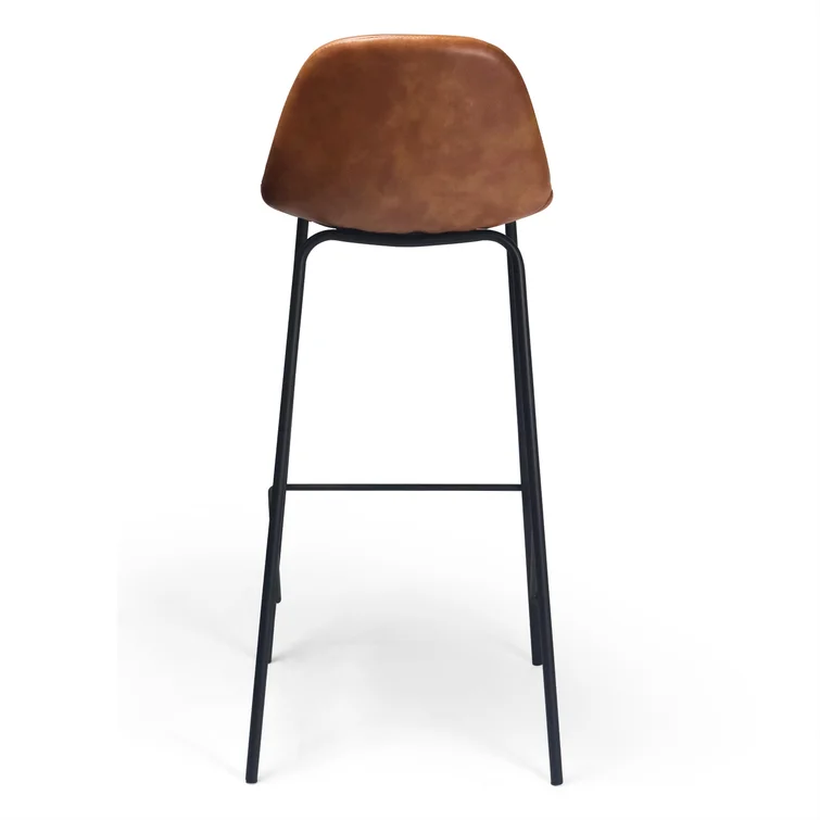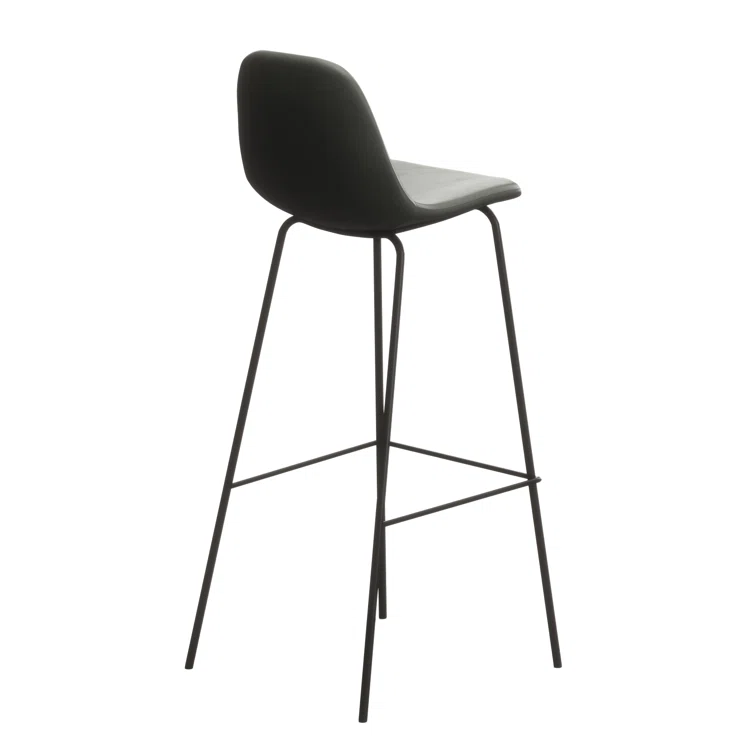 A laid-back blend of mid-century and industrial styles, this dining stool wraps an armless bucket seat in low-maintenance faux leather embellished with decorative stitching. Its open metal base features a footrest for stability and plastic glides to protect your floors. Set of two.
